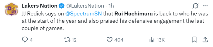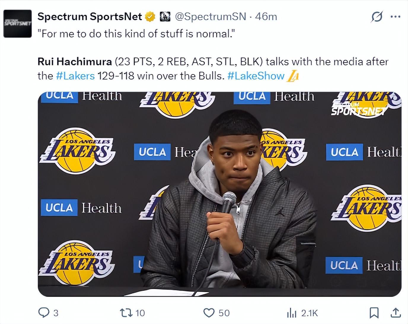 八村垒赛后接受采访,他盛赞了这个团队能看出他很不愿意离开LAL,他说道:我 要表扬我的教练,教练在会议上跟他们谈过了,让勒布朗、卢卡要多给队友球,他们也确实这样做了,他们总是接受教练的建议,所以我们能赢球,每个人都可以触球,每个人都能积极参与进攻,这才是篮球该有的样子。
